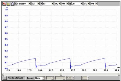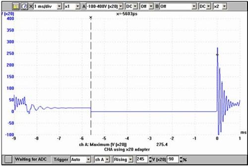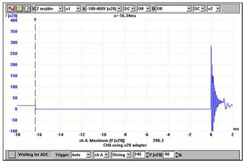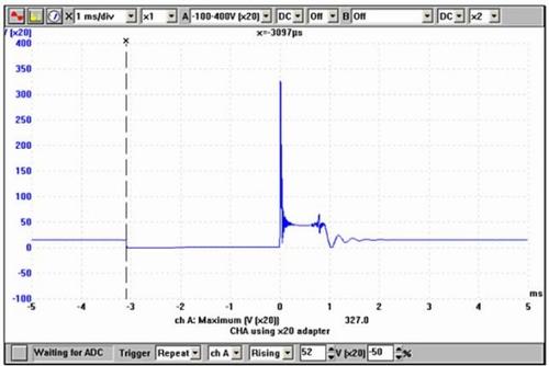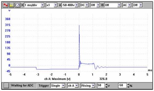 A következő ábra (2.) az indukált feszültség görbéjét mutatja, amely ebben az esetben 326 V-nál éri el a maximumát. Ez a feszültség a primer tekercs körül hirtelen összeomló mágneses erőtérnek a következménye. A mérés elvégzése azért fontos, mert az alacsony primer feszültség nem hoz létre megfelelő gyújtószikrát.