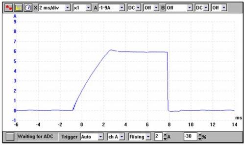 Az 1. ábrán látható primer áramköri áramerősség hirtelen elkezd emelkedni 6 A-ig, majd ez az érték marad egészen az áramkör bontásáig. A megszakítási sebesség leolvasható a görbe függőlegesbe hajlásáról. Bármilyen késedelem vagy lassú megszakítás lejtős görbeként jelenne meg, ami alacsony gyújtófeszültséget eredményez, míg az áramkör megfelelő bontása függőleges görbét mutat.