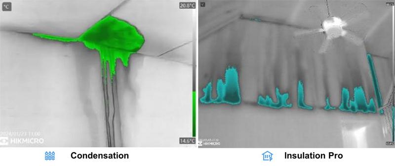 A HIKMICRO pro scenes színes riasztási algoritmusa további eszközökkel, például higrométerekkel együttműködve elemzi és riasztja a szigetelési és nedvességproblémák hőképeit a környezeti adatok alapján.
