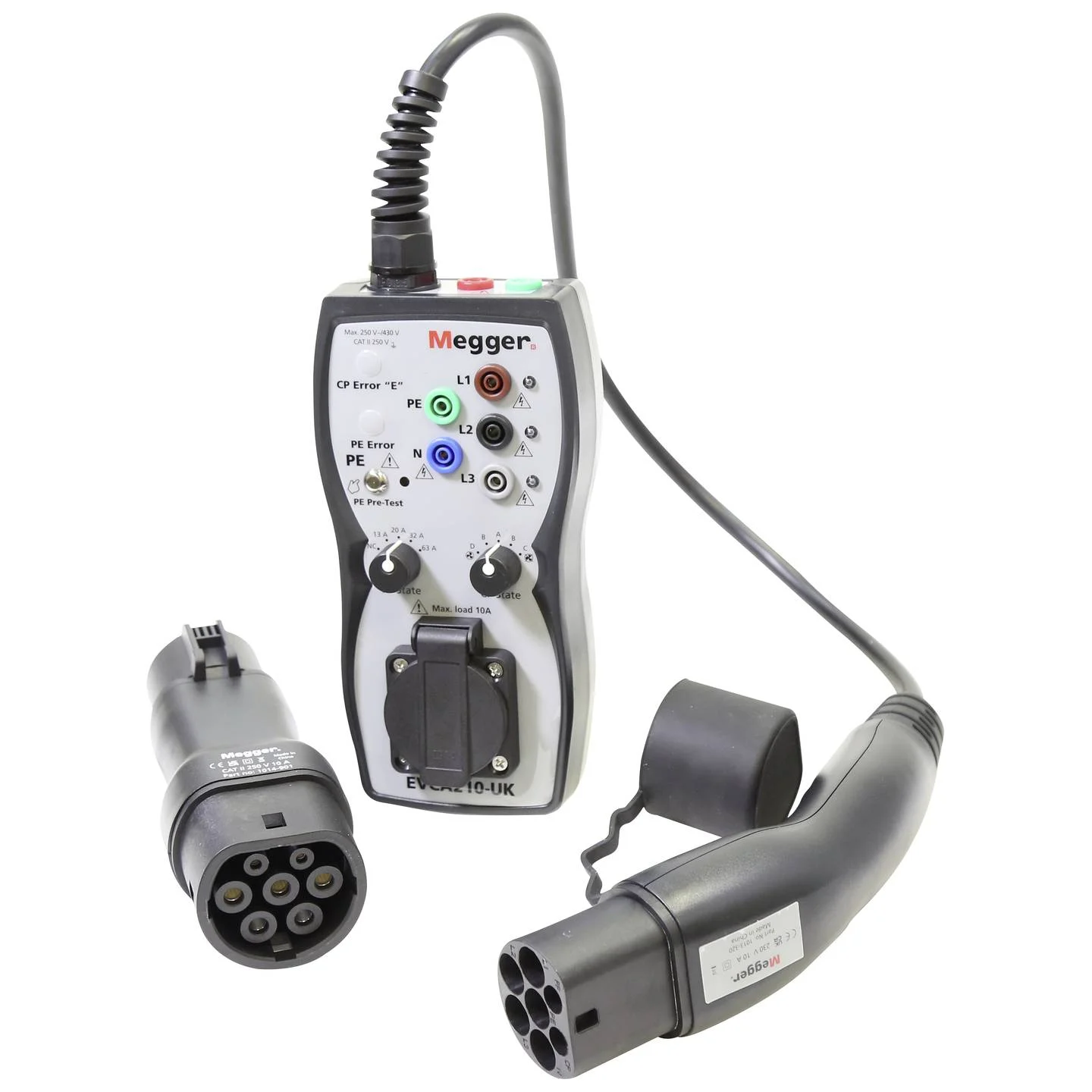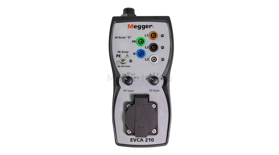 - A Megger EVCA210 tesztadapterek úgy vannak kialakítva, hogy szimulálják az elektromos jármű csatlakoztatását a tesztelt töltőponthoz. Az adapter csatlakoztatása lehetővé teszi a kezelő számára, hogy elindítsa a töltési folyamatot a megfelelő közelségi pilot (PP) és vezérlő pilot (CP) állapotok kiválasztásával